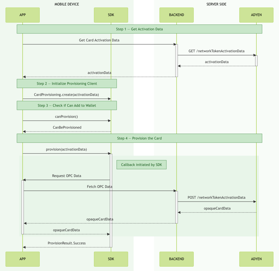 createSdkOutput().OpcProvider interface. This interface encapsulates the logic for fetching the OPC from your backend.provision(cardDisplayName, cardAddress, opcProvider) method, passing in your OpcProvider implementation.The SDK will now handle the orchestration of fetching the OPC data using your provided OpcProvider.
